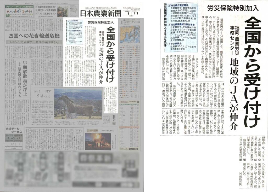 農業労災事務センターは、農業者が安心して労働できるよう、福岡県内のJAと協力して設立されました。センター内の「農業労災倶楽部」では従業員の労災保険・雇用保険加入を支援し、自営農業者や法人役員のためには「特別加入制度」も準備しています。ぜひお気軽にご相談ください。